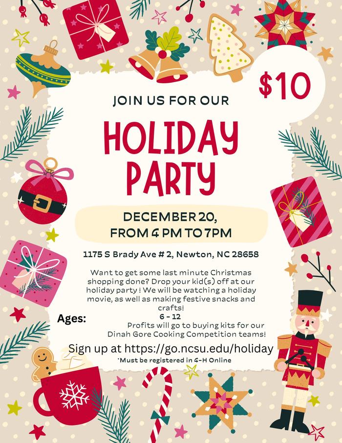 Want to get some last-minute Christmas shopping done? Drop your kid(s) off at our holiday party! We will be watching a holiday movie, as well as making festive snacks and crafts!